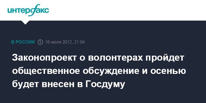 Москва. 16 июля. INTERFAX.RU - Законопроект о волонтерах будет принят только после широкого обсуждения с общественностью, заверяет вице-спикер Совета Федерации Юрий Воробьев.