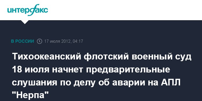 Владивосток. 17 июля. ИНТЕРФАКС - ДАЛЬНИЙ ВОСТОК - Предварительные слушания в рамках нового рассмотрения дела об аварии на подводной лодке "Нерпа" в 2008 году начнутся 18 июля в Тихоокеанском флотском военном суде во Владивостоке, сообщил агентству "Интерфакс - Дальний Восток" представитель суда.