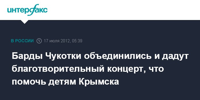 Анадырь. 17 июля. ИНТЕРФАКС-ДАЛЬНИЙ ВОСТОК – Творческое объединение бардов Чукотки "Белый берег" совместно с местным отделением Российского Красного Креста организуют благотворительный концерт, собранные средства от которого направят в помощь детям Крымска.
