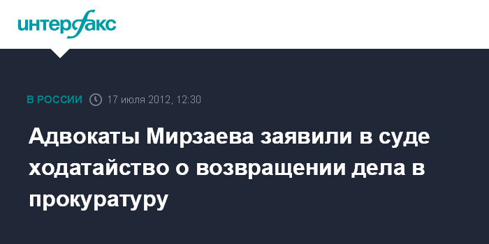 "Сторона защиты Мирзаева на заседании во вторник попросила суд вернуть дело в прокуратуру, так как они считают, что при вынесении обвинительного заключения были допущены многочисленные нарушения", - сообщила журналистам адвокат потерпевшего Оксана Михалкина.
