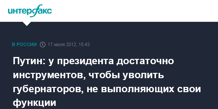 Москва. 17 июля. INTERFAX.RU - Президент РФ Владимир Путин заявил, что у главы государства достаточно полномочий для того, чтобы решить вопросы об увольнении губернаторов, которые не выполняют поставленных перед ними задач.