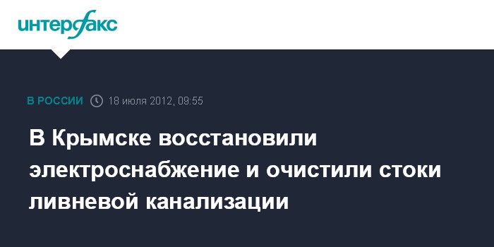 Крымск. 18 июля. INTERFAX.RU - В оперативном штабе по ликвидации ЧС в Крымском районе заявляют о восстановлении жизненно важных систем, в том числе электроэнергии, водоснабжения, канализации.