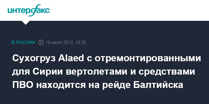 Москва. 18 июля. INTERFAX.RU - Сухогруз Alaed с отремонтированными для Сирии тремя вертолетами Ми-25 и средствами ПВО по состоянию на 09:00 находился на рейде Балтийска, сообщил "Интерфаксу" представитель компании FEMCO Владислав Гречка.