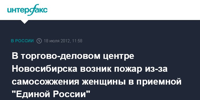 Новосибирск/Москва. 18 июля. INTERFAX.RU - Причиной пожара в торгово-деловом центре в Новосибирске стала попытка самосожжения женщины в приемной "Единой России", сообщили в мэрии Новосибирска.