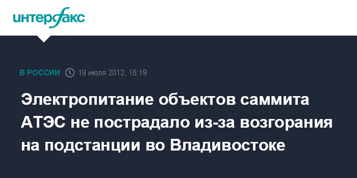 Владивосток. 18 июля. INTERFAX.RU – Возгорание на ПС "Эгершельд" не могло затронуть энергоснабжение объектов саммита АТЭС на острове Русский, поскольку эти объекты обеспечивает новая ПС 220 кВ "Русский" (ОАО "ФСК"), сообщает пресс-служба РАО "ЭС Востока".