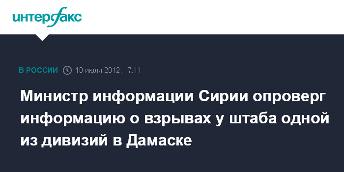 Лондон. 18 июля. INTERFAX.RU - Министр информации Сирии опроверг появившиеся на телеканале "Аль-Джазира" сообщения о серии из пяти взрывов, прогремевших рядом со штабом одной из дивизий в Дамаске, сообщила в среду телерадиокорпорация BBC.