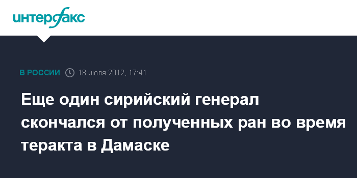Бейрут. 18 июля. INTERFAX.RU - Генерал сирийской армии Хасан Туркмени умер от ранений, полученных во время теракта у здания службы госбезопасности в сирийской столице Дамаске, сообщает в среду ливанский телеканал "Аль-Манар".