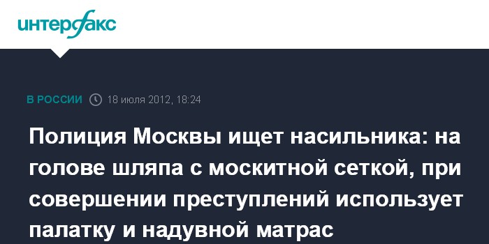 Полиция Москвы ищет насильника: на голове шляпа с москитной сеткой, при совершении преступлений использует палатку и надувной матрас