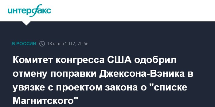 Вашингтон. 18 июля. INTERFAX.RU - Финансовый комитет сената США единогласно одобрил законопроект об отмене действовавшей в отношении СССР и РФ поправки Джексона-Вэника и о предоставлении российской стороне статуса нормального торгового партнера, включающего положения проекта закона о "списке Магнитского", передают в среду местные СМИ.