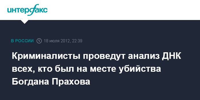 Москва. 18 июля. INTERFAX.RU - Полицейские в рамках расследования убийства 5-летнего Богдана Прахова во Владимирской области проверят ДНК всех, кто присутствовал на месте преступления, сообщает в среду сайт МВД России.