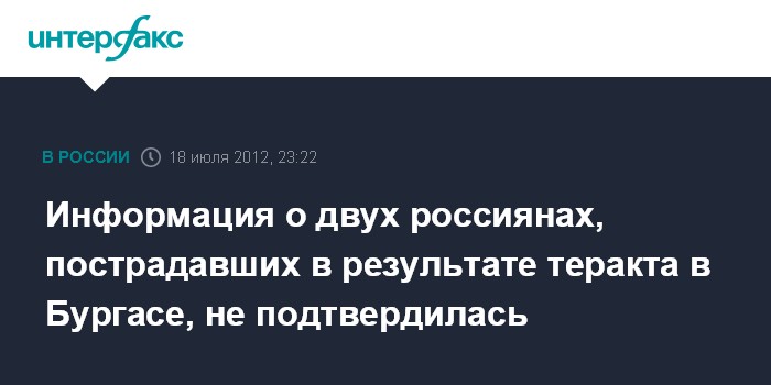 Москва. 18 июля. INTERFAX.RU - В посольстве России в Болгарии не подтверждают информацию о том, что в результате теракта в Бургасе пострадали двое россиян.