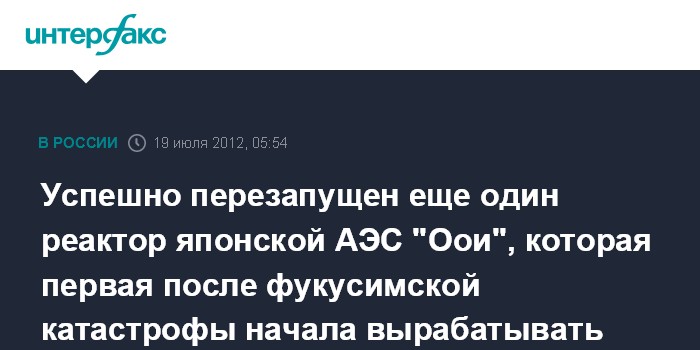 Токио. 19 июля. ИНТЕРФАКС - Реактор N4 АЭС "Оои" в префектуре Фукуи на западе Японии возобновил работу рано утром в четверг вслед за перезапущенным десять дней назад реактором N3, передают японские СМИ.