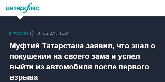 Москва. 19 июля. INTERFAX.RU - Муфтий Татарии Илдус Файзов в момент покушения знал об убийстве своего заместителя Валиуллы Якупова, и, почувствовав первый слабый взрыв в машине, успел покинуть автомобиль.
