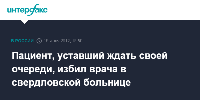 Екатеринбург. 19 июля. INTERFAX.RU - В больнице города Качканара (Свердловская область) местный житель напал на хирурга, устав ждать своей очереди на прием.