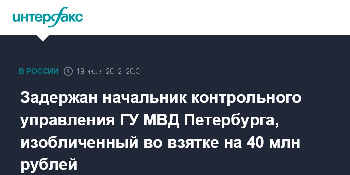 Задержан начальник контрольного управления ГУ МВД Петербурга, изобличенный во взятке на 40 млн рублей