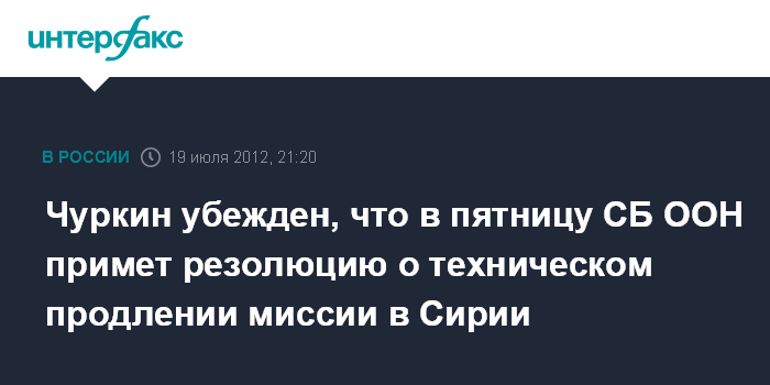Нью-Йорк (ООН). 19 июля. INTERFAX.RU - Постпред России при ООН Виталий Чуркин выразил уверенность в том, что 20 июля СБ ООН примет резолюцию о техническом продлении миссии ООН в Сирии.