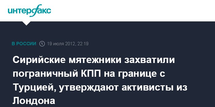 Лондон/Багдад. 19 июля. INTERFAX.RU - Сирийские мятежники в четверг взяли под контроль первый с момента начала волнений в Сирии пограничный КПП на границе с Турцией, утверждает действующий из Лондона Сирийский наблюдательный совет по правам человека. "Повстанцы взяли под контроль пограничный КПП Баб аль-Хава на сирийско-турецкой границе. Это произошло впервые", - сообщил представитель Совета.