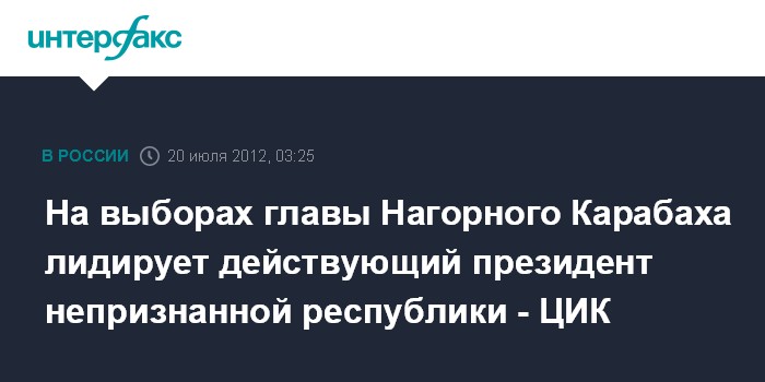 Ереван. 20 июля. ИНТЕРФАКС - Действующий президент непризнанной Нагорно-Карабахской республики Бако Саакян, по предварительным данным ЦИК, опережает своих соперников на президентских выборах.
