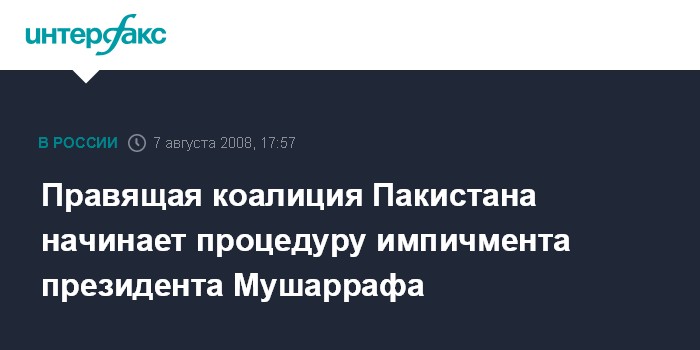 Москва. 7 августа. INTERFAX.RU - Партии, входящие в правящую коалицию Пакистана, объявили в четверг, что начинают процесс импичмента президента страны Первеза Мушаррафа.
