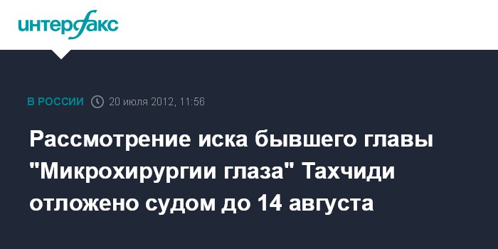 Рассмотрение иска бывшего главы "Микрохирургии глаза" Тахчиди отложено судом до 14 августа