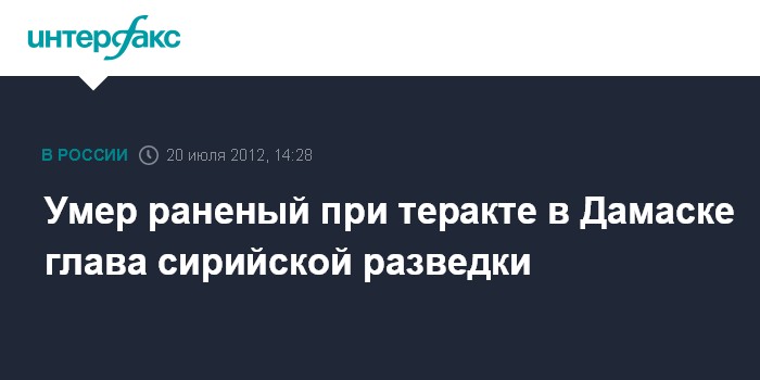 Бейрут. 20 июля. INTERFAX.RU- Руководитель сирийской разведслужбы Хишам Бахтияр скончался от ранений, полученных в результате взрыва в Дамаске 18 июля, сообщил в пятницу ливанский телеканал "Аль-Манар".