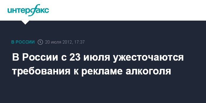 Москва. 20 июля. INTERFAX.RU - В России с 23 июля вступают в силу поправки к статье 21 закона "О рекламе", которые ужесточают требования к рекламе алкогольной продукции.