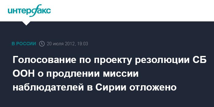 Москва. 20 июля. INTERFAX.RU - Совет Безопасности ООН отложил на неопределенное время голосование по резолюции о продлении миссии наблюдателей ООН в Сирии, которое было намечено на 18:00 мск, и удалился на закрытые консультации.