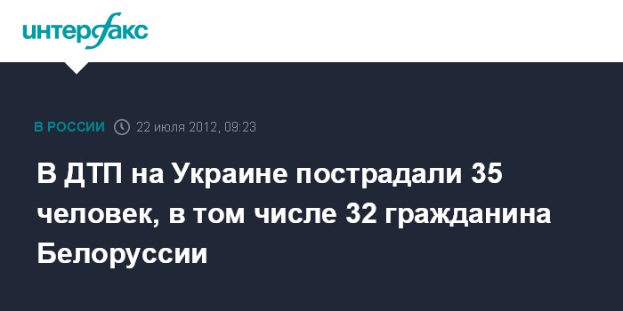 Киев. 22 июля. ИНТЕРФАКС-УКРАИНА - В Херсонской области Украины на 105-м км автодороги Симферополь-Херсон произошло ДТП, в результате которого пострадали 35 человек, из них 32 - граждане Белоруссии.
