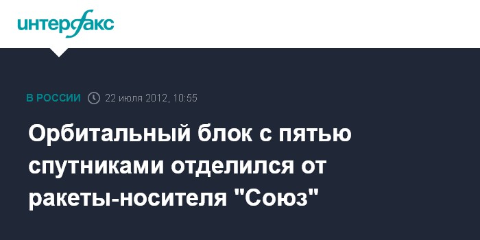Байконур. 22 июля. INTERFAX.RU - Орбитальный блок в составе пяти спутников России, Белоруссии, Канады и Германии и разгонного блока "Фрегат" успешно отделился от ракеты-носителя "Союз-ФГ", стартовавшей в воскресенье с космодрома Байконур. "В 10:50 МСК орбитальный блок успешно отделился от ракеты-носителя и продолжает самостоятельный полет", - сообщил "Интерфаксу-АВН" руководитель пресс-службы Федерального космического агентства (Роскосмос) Алексей Кузнецов.