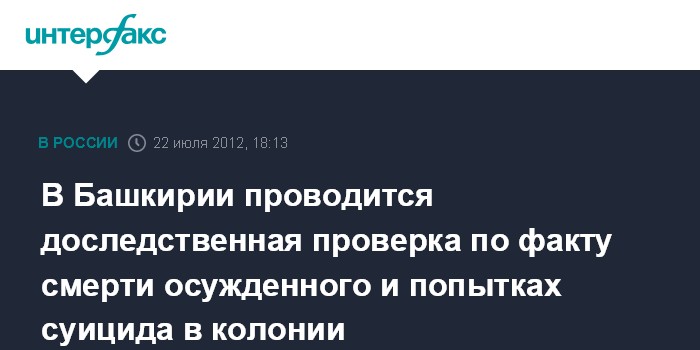 Москва/Уфа. 22 июля. INTERFAX.RU - Следователи проводят проверку в связи с инцидентами в башкирской колонии, откуда приходят сообщения о попытках самоубийства и массовом отказе осужденных от приема пищи. "22 июля в следственные органы поступило сообщение о том, что в ФГУ "Исправительная колония № 4 ГУФСИН России по Республике Башкортостан" 5 осужденных пытались покончить жизнь самоубийством. Сегодня также переданы материалы по факту смерти в больнице города Салават 35-летнего осужденного той же колонии", - говорится в сообщении на сайте СК РФ.