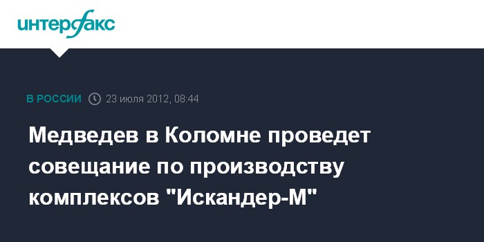 Как сообщила пресс-служба правительства РФ, в Коломне на площадке ОАО "Научно-производственная корпорация "Конструкторское бюро машиностроения" (ОАО "НПК "КБМ") Медведев проведет совещание по вопросу рассмотрения хода выполнения мероприятий по ФЦП "Развитие оборонно-промышленного комплекса Российской Федерации на 2011-2020 годы" по модернизации производственных мощностей для выпуска ракетных комплексов "Искандер-М".