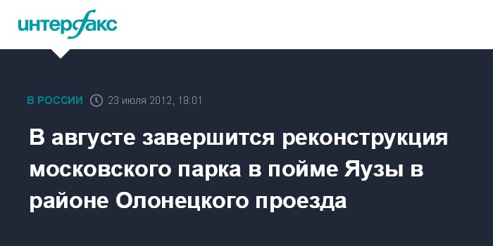 Москва. 23 июля. INTERFAX.RU - Парк в пойме реки Яуза в районе Олонецкого проезда будет реконструирован в августе 2012 года.
