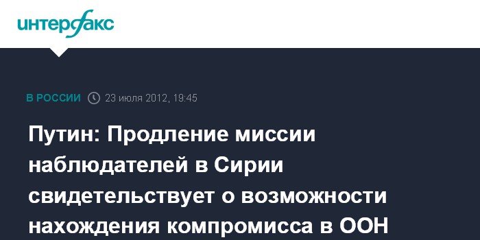 Сочи (Бочаров ручей). 23 июля. INTERFAX.RU - Президент РФ Владимир Путин заявил, что решение о продлении миссии наблюдателей Сирии говорит о том, что компромисс на площадке ООН возможен.