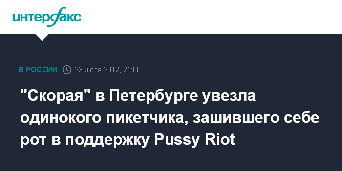 Санкт-Петербург. 23 июля. INTERFAX.RU - В Петербурге у Казанского собора прошел одиночный пикет в поддержку панк-группы Pussy Riot, его участник зашил себе рот.