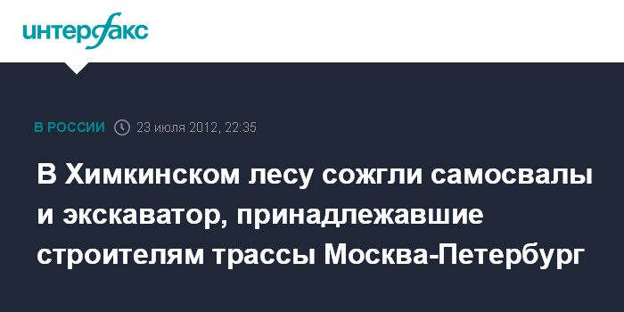 Москва. 23 июля. INTERFAX.RU - Неизвестные подожгли строительную технику на территории проведения работ по строительству трассы Москва-Санкт-Петербург в Химкинском лесу и сломали руку рабочему, сообщают госкомпания "Автодор" и ООО "Северо-Западная концессионная компания".