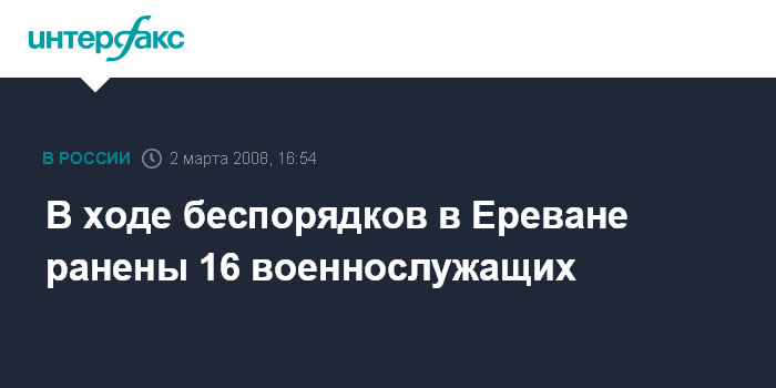 Москва. 2 марта. INTERFAX.RU - В результате беспорядков в столице Армении в больницы Еревана поступили 131 человек, из числа которых восемь скончались. Согласно сообщению пресс-секретаря министра здравоохранения Армении Руслана Геворкяна, "из 72 госпитализированных военнослужащих 16 были с огнестрельными ранениями, а из 59 гражданских огнестрельные ранения получили 18 человек".