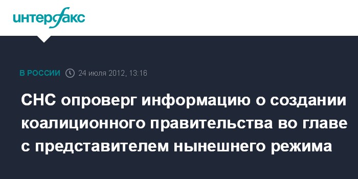 Москва. 24 июля. INTERFAX.RU - Оппозиционный Сирийский национальный совет опровергает информацию о том, что он готов к созданию коалиционного правительства страны во главе с представителем нынешнего режима.