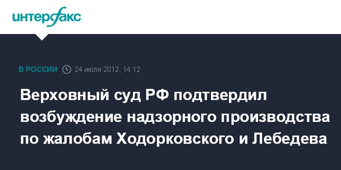 Москва. 24 июля. INTERFAX.RU - В Верховном суде России официально подтвердили факт возбуждения главой высшей судебной инстанции надзорного производства по жалобам экс-руководителей "ЮКОСа" Михаила Ходорковского и Платона Лебедева.