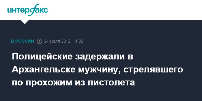 Архангельск. 24 июля. INTERFAX.RU - Полицейские задержали в центре Архангельска молодого человека, устроившего стрельбу из пневматического пистолета по прохожим и проезжающим машина, сообщает во вторник пресс-служба регионального УМВД.