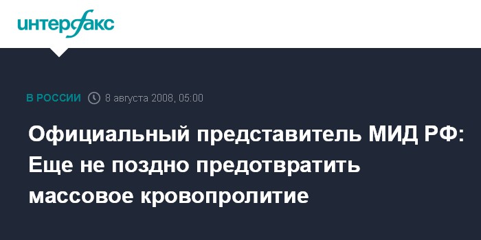 Москва. 8 августа. ИНТЕРФАКС - Официальный представитель МИД России Борис Малахов заявил, что в Москве убеждены в возможности предотвратить массовое кровопролитие в Южной Осетии. "Сейчас еще не поздно предотвратить массовое кровопролитие и новые жертвы, в том числе среди мирного населения", - заявил он в эфире телеканала "Вести-24".