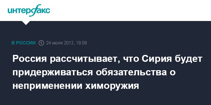 Москва. 24 июля. INTERFAX.RU - В Москве полагают, что Сирия, еще в 1968 году присоединившаяся к Женевскому протоколу о запрете применения химического оружия, будет соблюдать свои обязательства.