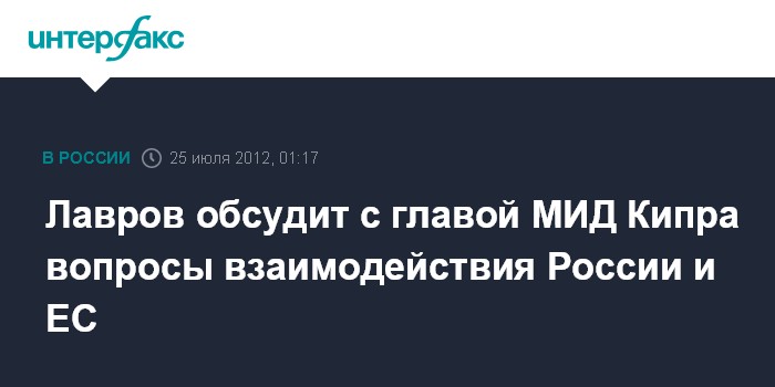 Москва. 25 июля. ИНТЕРФАКС - Министры иностранных дел России и Кипра Сергей Лавров и Эрато Козаку-Маркули в среду в Москве проведут переговоры.