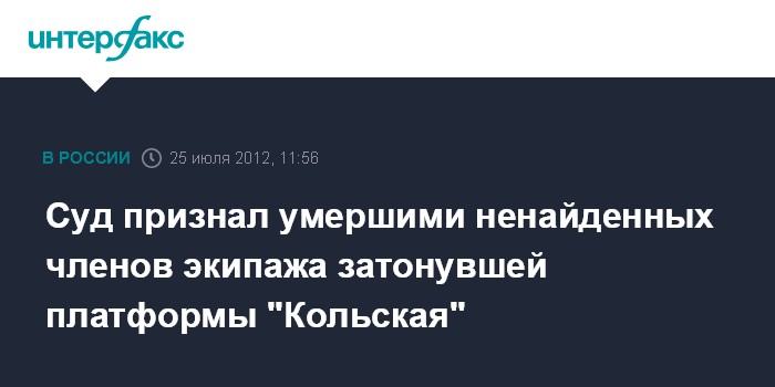 Мурманск. 25 июля. INTERFAX.RU- Первомайский районный суд Мурманска признал умершими 24 члена экипажа затонувшей платформы "Кольская", тела которых не были найдены в ходе декабрьской поисковой операции, сообщили "Интерфаксу" в суде.