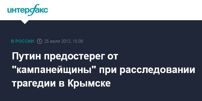 Геленджик. 25 июля. INTERFAX.RU - Президент России Владимир Путин заявил, что нельзя допускать "кампанейщины" при выяснении вопроса об ответственности должностных лиц за последствия наводнения в Краснодарском крае.