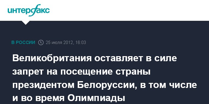 Минск. 25 июля. INTERFAX.RU - Посольство Великобритании в Минске подтвердило, что британские власти оставляют в силе запрет на въезд в страну президента Белоруссии Александра Лукашенко, в том числе и на период проведения в Лондоне Олимпийских игр.