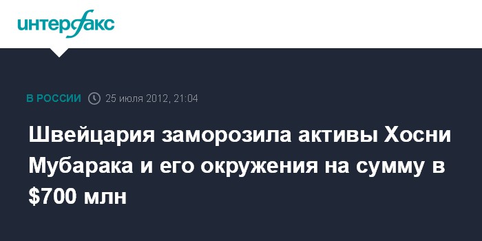 Берн. 25 июля. INTERFAX.RU - Власти Швейцарии ввели дополнительные санкции против бывшего президента Египта Хосни Мубарака и его окружения, заморозив их финансовые активы на сумму в $700 млн, сообщают в среду местные СМИ.