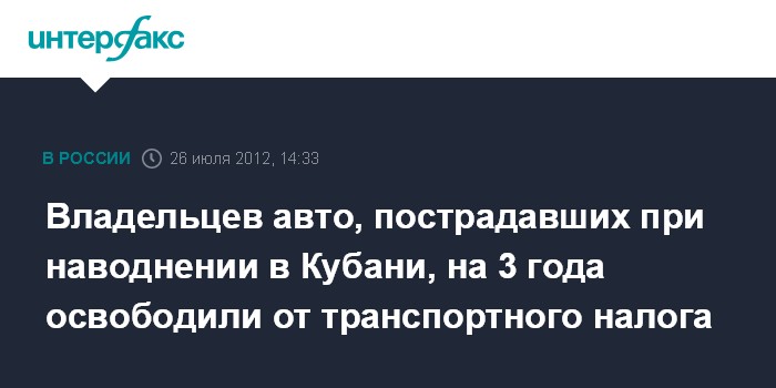 Юридические лица за утерянный во время наводнения транспорт будут освобождены от транспортного налога на 2012 год, транспортные средства, пострадавшие при наводнении и требующие ремонта, освобождаются от уплаты налога на трехлетний период.