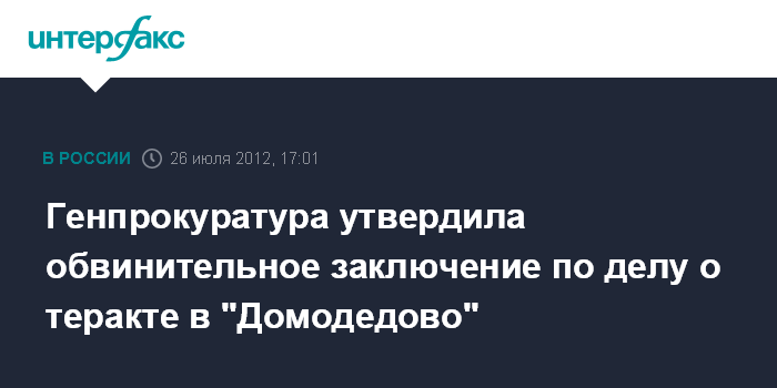 Москва. 26 июля. INTERFAX.RU - Генеральная прокуратура России утвердила обвинительное заключение по делу о теракте в столичном аэропорту "Домодедово" и направила материалы уголовного дела в суд.