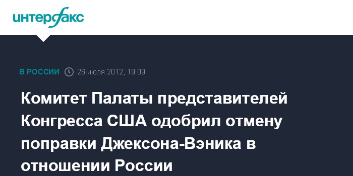 Вашингтон. 26 июля. INTERFAX.RU - Бюджетный комитет палаты представителей конгресса США принял законопроект об отмене действия поправки Джексона-Вэника в отношении России и Молдавии, сообщил председатель комитета.