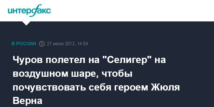 Москва. 27 июля. INTERFAX.RU - Глава ЦИК России Владимир Чуров объяснил, что воспользовался воздушным шаром для прибытия на "Селигер", поскольку такой вид путешествия, описанный в романе Жюля Верна "Таинственный остров", "запал в душу" с детства.